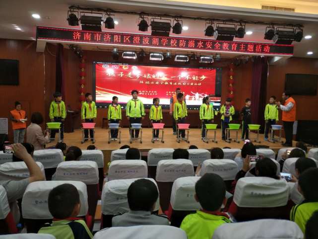 在济阳区澄波湖学校的报告厅作报告,通过直播同时为全校5500名师生上防溺水安全课